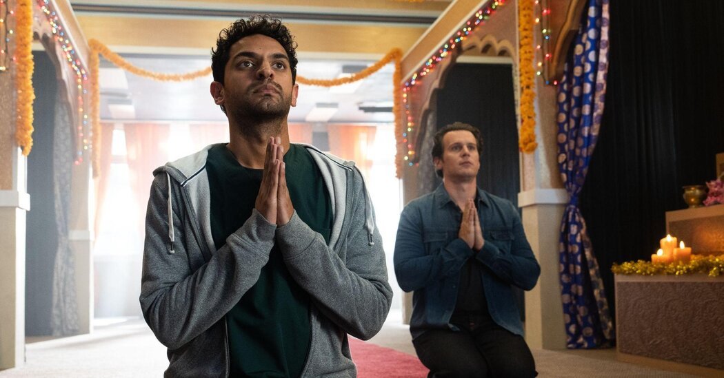 Jay (Jonathan Groff) and Naveen (Karan Soni) experience their first meet-cute while worshiping at the same Hindu temple, united by their shared culture: Naveen is Indian, and Jay is white with adoptive Indian parents.