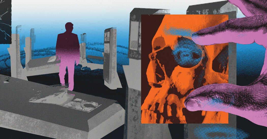In David Cronenberg’s newest film, “The Shrouds,” a widower named Karsh Relikh, played by Vincent Cassell, takes a woman on a blind date to his dead wife’s grave. They stop in front of her tombstone — a double plot, with empty space for Karsh to occupy in the future — and pay their respects in a very Cronenbergian way. On a screen on the headstone is a real-time image of his wife’s body, decaying in its grave, captured by the high-tech metallic “shroud” she was buried in; it is also transmitted to a smartphone app that allows Karsh to zoom and rotate the image at will. This technology allows people to remain connected to their loved ones by watching their bodies disintegrate, like a mash-up of the Buddhist corpse meditation and a mindfulness app. “I can see what’s happening to her,” Karsh says, enraptured, as his date squirms in discomfort. “I’m in the grave with her. I’m involved with her body the way I was in life, only even more.”